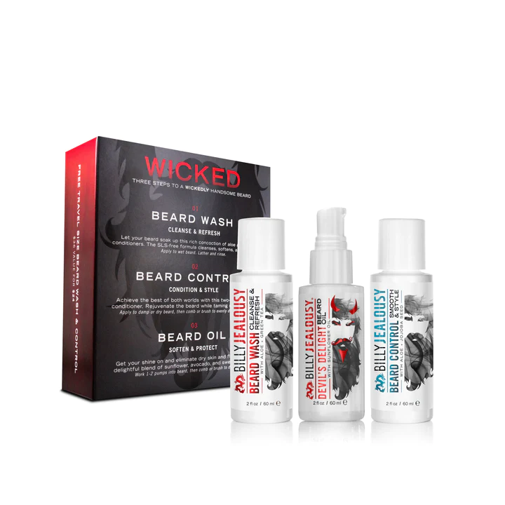 This travel-friendly kit includes everything you need to build a routine that cleanses, nourishes, and strengthens your beard. The Wicked Beard trio includes our sulfate-free Beard Wash, hydrating leave-in Beard Control, and award-winning Devil’s Delight Beard Oil, perfect for the bearded traveler. Our Beard Wash and Control combo will leave your beard feeling fresh and looking neatly groomed. Top off your beard with Devil’s Delight Beard Oil to soften rough or scraggly hairs, and add a touch of shine and a whiff of black pepper & sandalwood.
